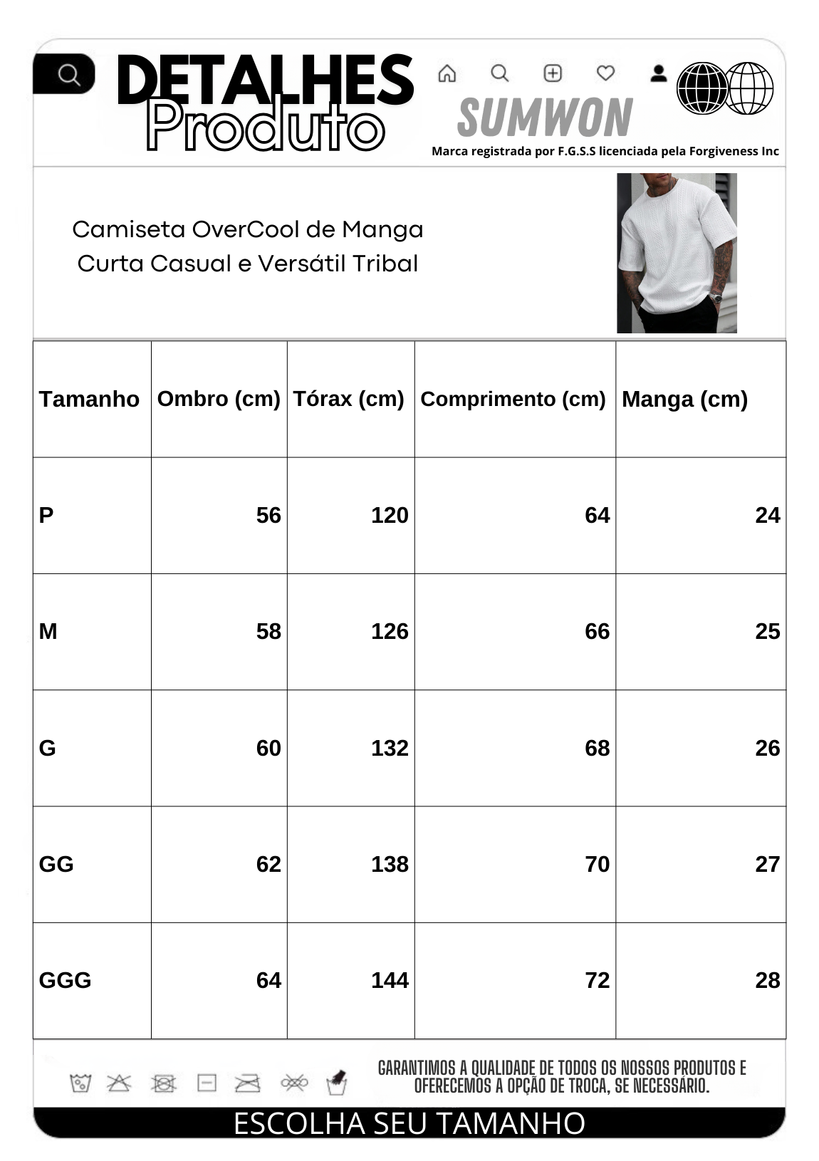 | Tamanho | Ombro (cm) | Tórax (cm) | Comprimento (cm) | Manga (cm) |