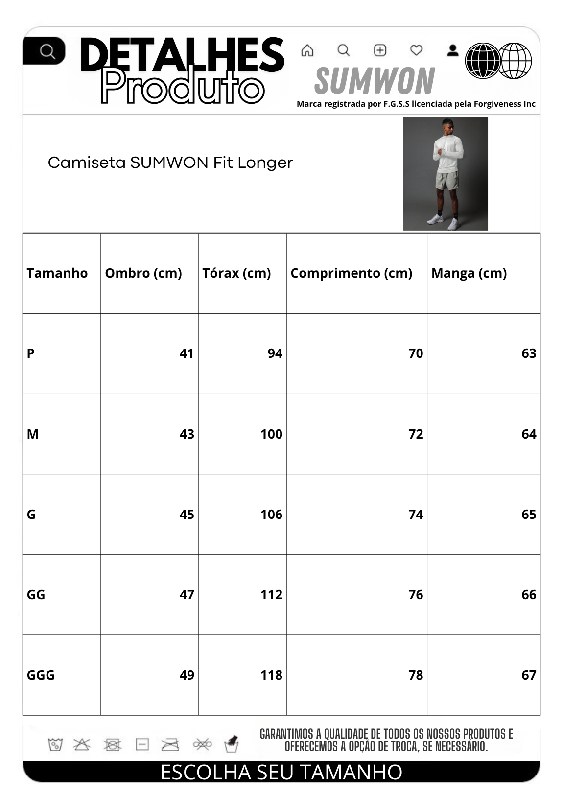 | Tamanho | Ombro (cm) | Tórax (cm) | Comprimento (cm) | Manga (cm) |