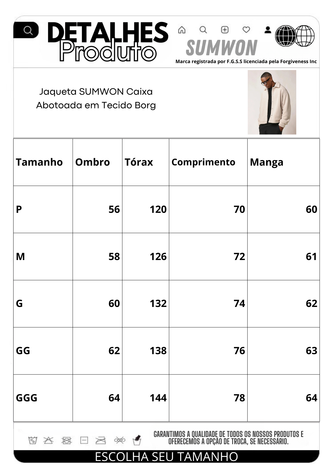 | Tamanho | Ombro | Tórax | Comprimento | Manga |