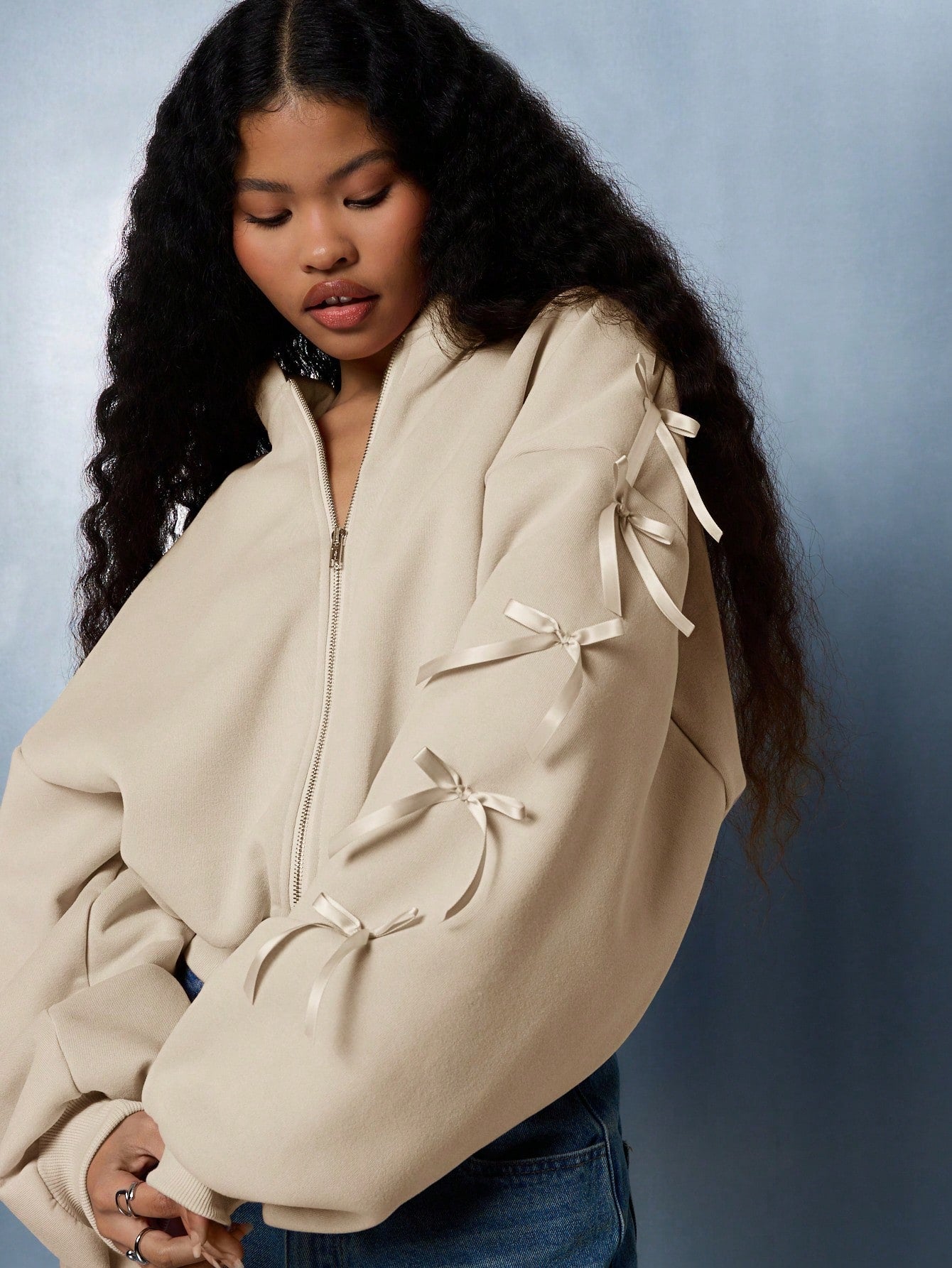 Os laços aplicados manualmente nos braços oferecem contraste ao corte amplo e minimalista, criando uma peça sofisticada com personalidade.