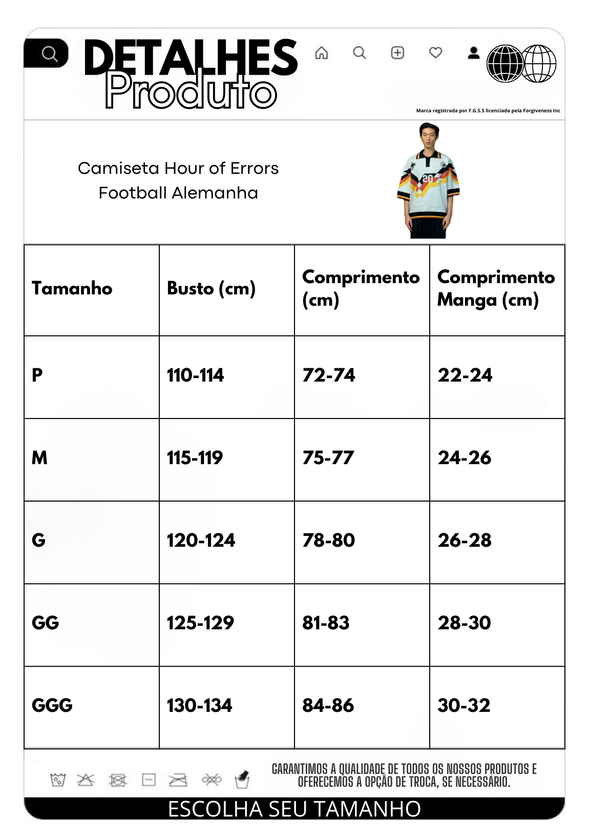 | Tamanho | Busto (cm) | Comprimento (cm) | Comprimento Manga (cm) |