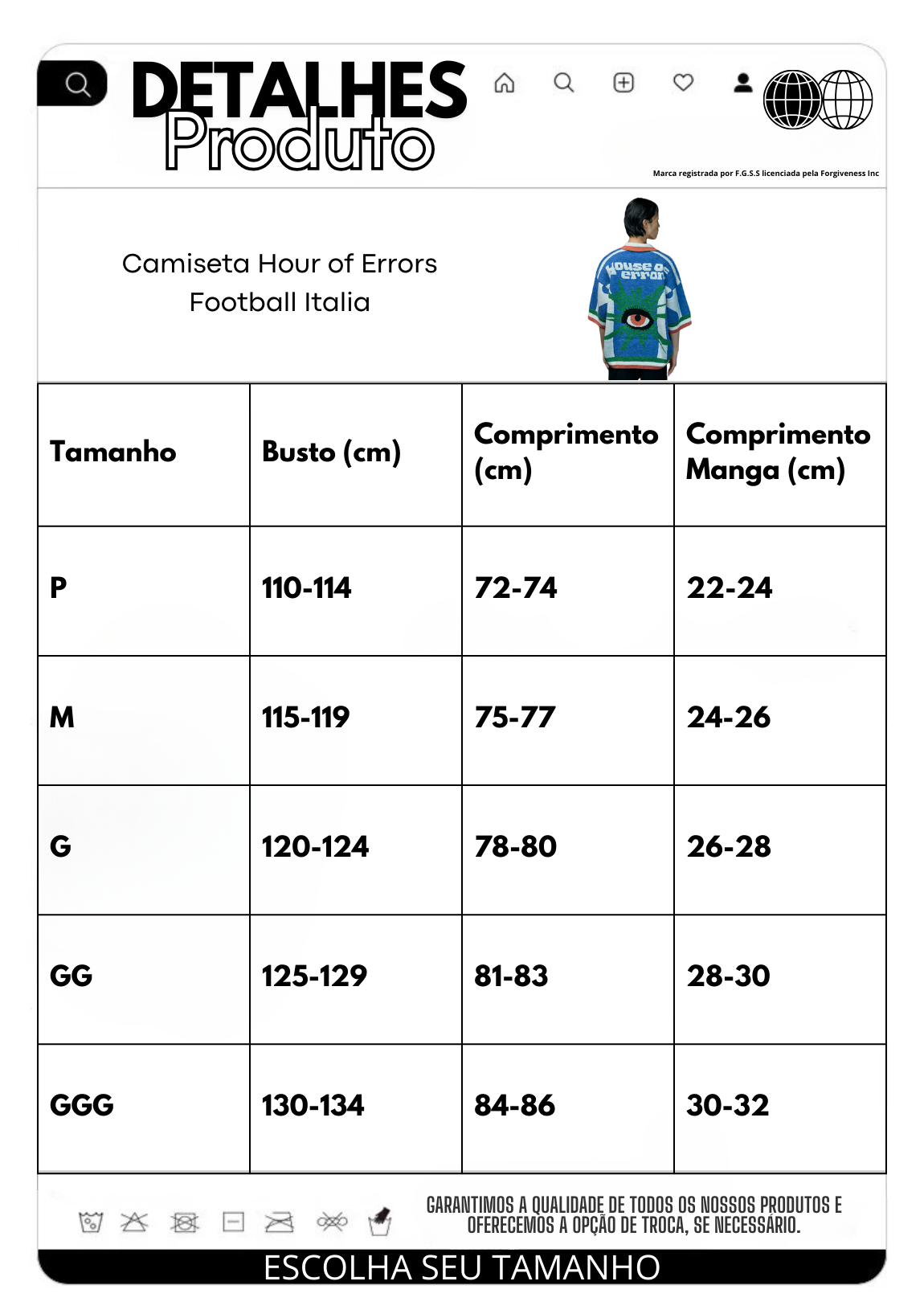| Tamanho | Busto (cm) | Comprimento (cm) | Comprimento Manga (cm) |