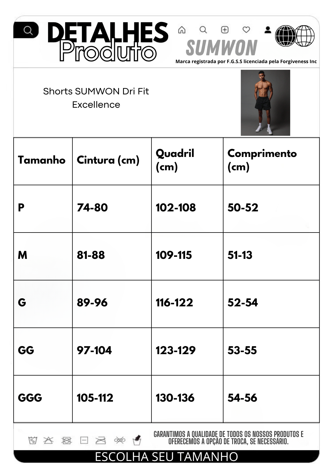 O Shorts SUMWON Dri Fit Excellence foi desenvolvido para unir leveza, respirabilidade e sofisticação em uma única peça. Com tecido tecnológico de secagem rápida, proporciona liberdade total de movimento e conforto térmico em qualquer situação — do treino à composição urbana. O design é clean, funcional e feito para quem valoriza alta performance com estilo discreto e refinado.